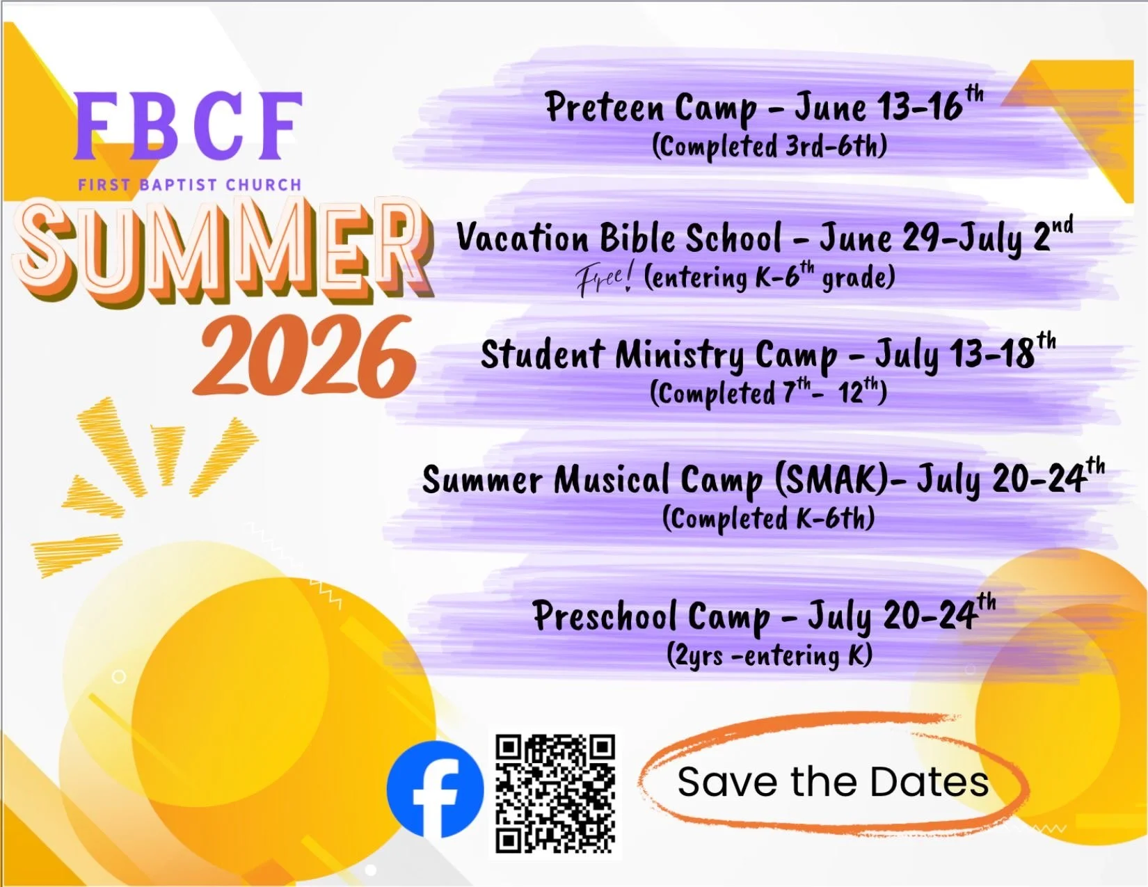 Summer Ministries: Include preteen camp, Vacation Bible School, Adventure Week, Preschool Camp, Summer Musical Activities for Kids (S.M.A.K.), and 1st & 2nd grade camp.